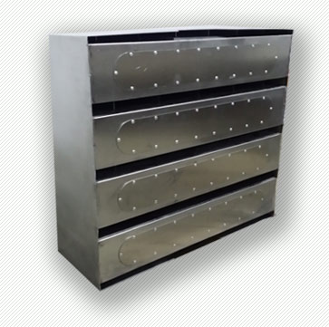 碘吸附器由不銹鋼殼體活性炭吸附劑層、密封材料及附件等部分組成,結構如圖所示。在方形的不銹鋼殼體內,布有等距的V形和半V形篩板。每塊篩板的兩翼之間作為氣流通道,相鄰篩板之間則裝填活性炭層,使碘吸附器內部的炭層呈折疊式分布。含有放射性的氣體穿過炭層時,氣態碘、氡子體、放射性氣溶膠可被活性炭有效去除。各篩板均與殼體點焊,篩板之間焊有支撐板,再由蓋板或底板來限位和固定,以充分保證其整體強度。與以往的國內樣機相比,這種碘吸附器結構的機械強度高,吸附能力強。